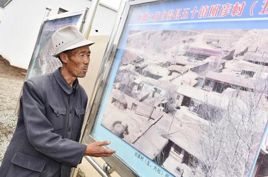 8月23日,青海省海东市互助土族自治县五十镇班彦村村民吕有章,指着村子旧址的照片对记者讲述与习近平总书记见面的情景。 新华社记者 吴刚 摄